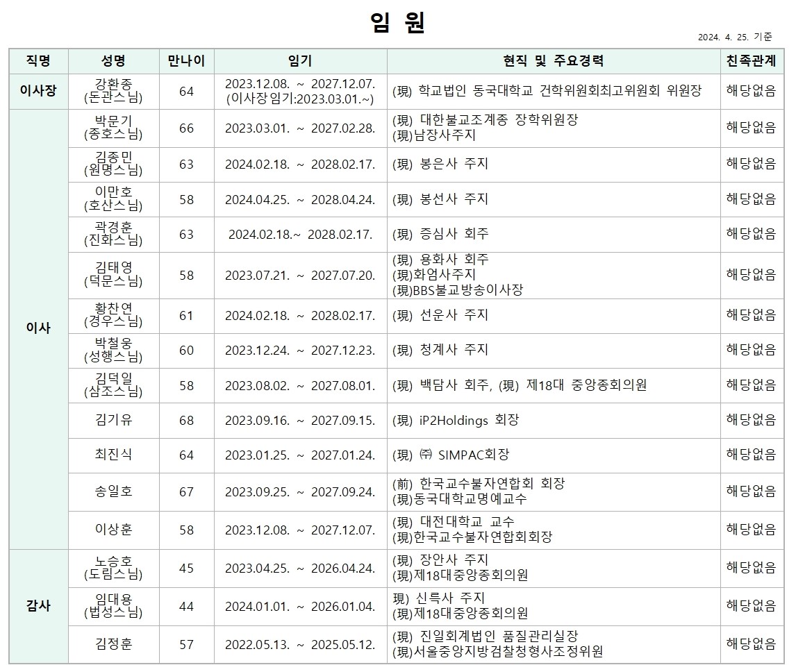 2024년 4월 25일 기준 학교 법인 동국대학교 이사회 임원 현황입니다.